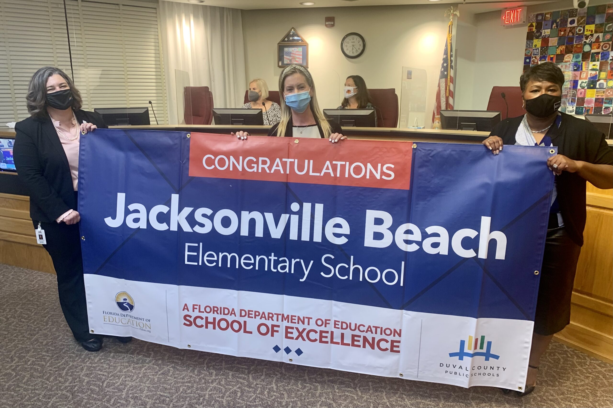Superintendent, Board Member and school administrator hold banner Congratulations Jacksonville Beach Elementary School a Florida Department of Education School of Excellence